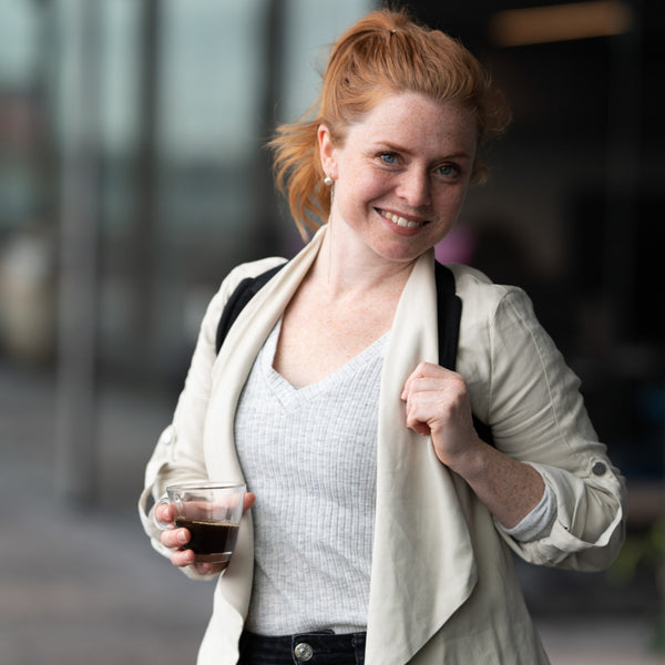 Eine lächelnde Frau mit roten Haaren trägt den Haltungstrainer Schwarz S-M und einen Rucksack, während sie im Freien ein Getränk hält.