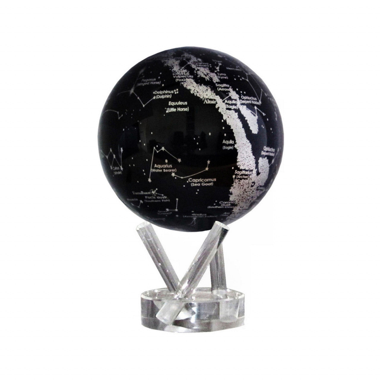 Der Schwebeglobus Mova – Silver Constellation ist ein schwarzer Himmelsglobus mit Sternbildern, montiert auf einem schlanken, durchsichtigen Acrylständer.