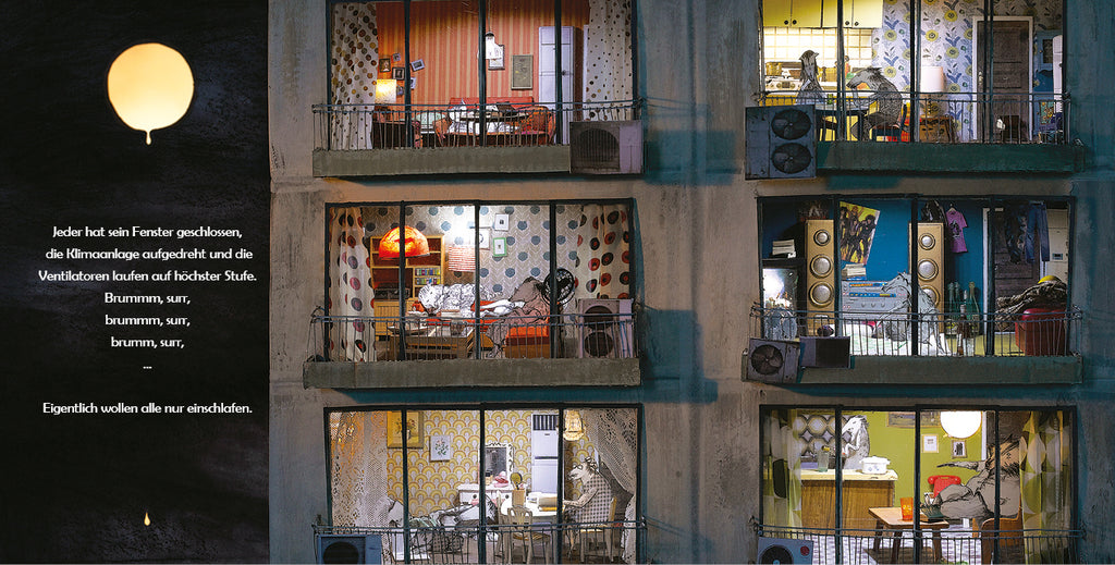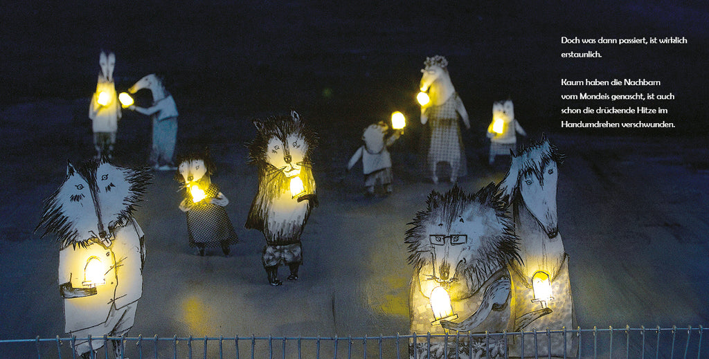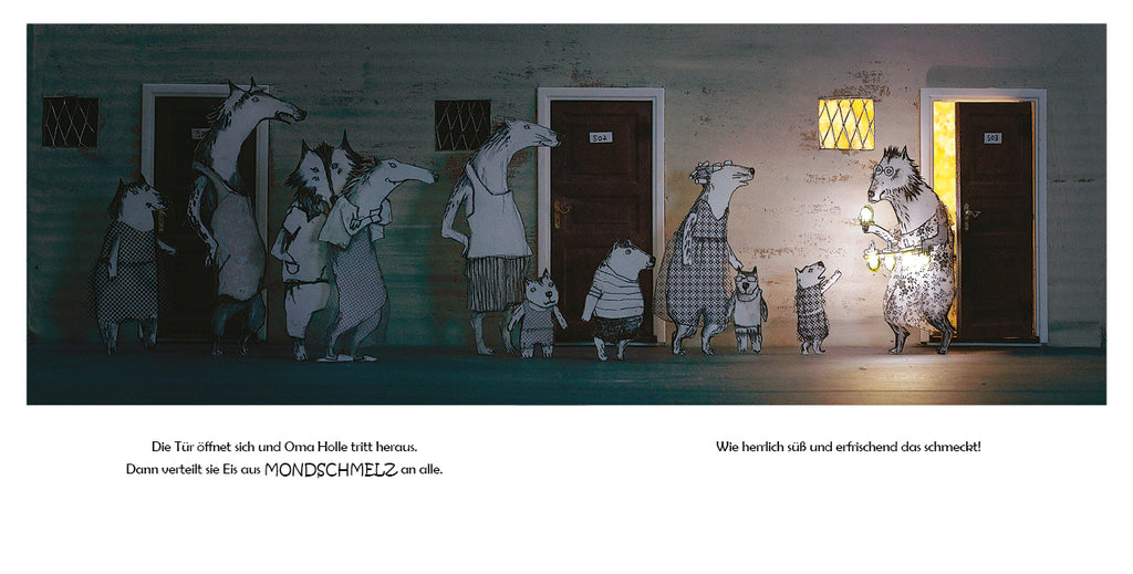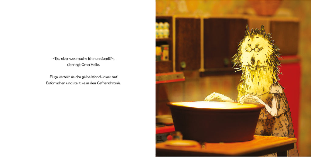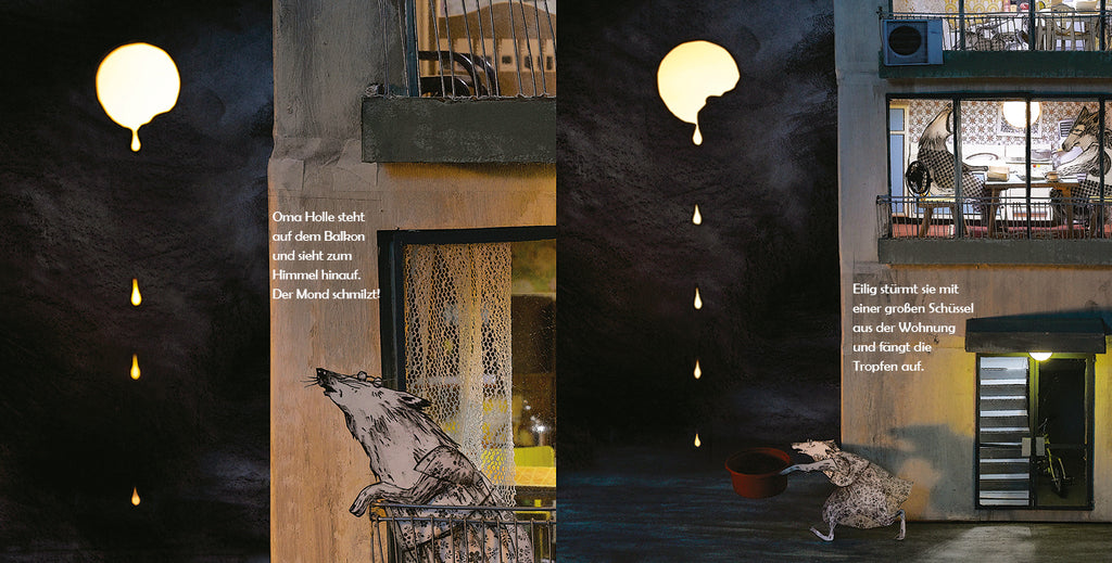 »Wir haben beim Mann im Mond gewohnt. Und jetzt wissen wir nicht, wohin«, sagen Hüpf und Hopps im Chor.Au weia! Der Mond schmilzt. Mitten in der Nacht. Weil es so heiß ist. Und keiner der Mietshausbewohner merkt es, außer Oma Holle, die eilends die Tropfen in einer Schüssel auffängt. Dann fällt der Strom aus und alle kommen aus ihren Wohnungen. Nur bei Oma Holle ist noch Licht. Was ist da los? ...