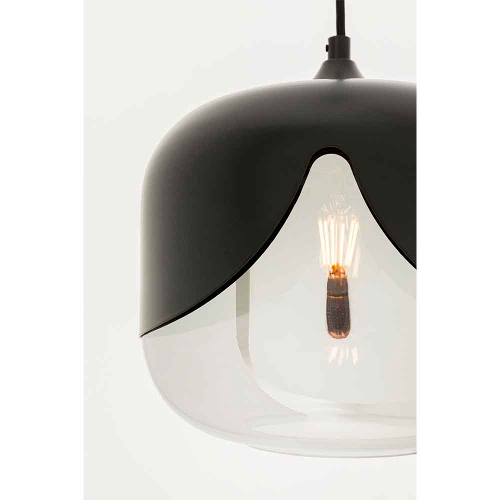 Eine moderne Pendelleuchte mit einem schwarzen, kuppelförmigen Oberteil und einem Unterteil aus Klarglas, das eine freiliegende Glühbirne im Inneren offenbart.