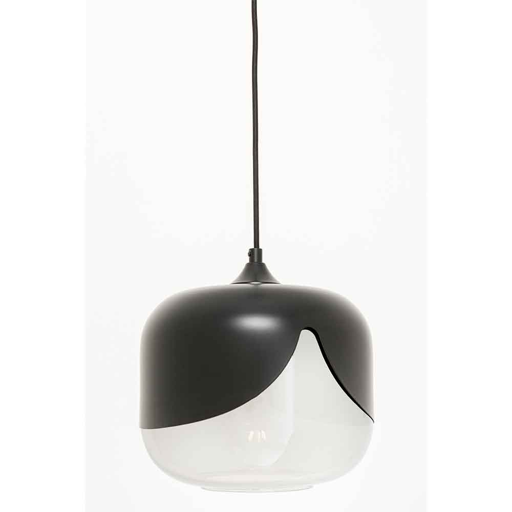 Eine moderne Pendelleuchte mit einer mattschwarzen Oberseite und einer unteren Hälfte aus klarem Glas, aufgehängt an einer schwarzen Schnur.