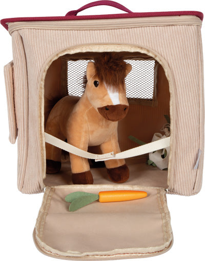 Lieferumfang: 1x Tragetasche/ Stall, 1x Pferde-Plüschtier, 3x Zaunteile, 1x Futtertasche, 1x Sattel mit Satteldecke, 1x Zaumzeug, 1x Karotte, 1x Kehrschaufel, 1x Hake, 1x Holz-Pferdeäpfel