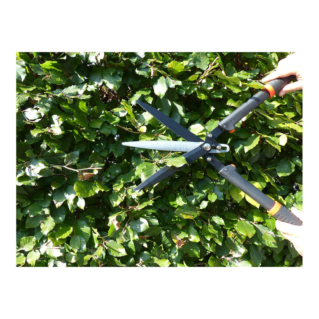 • Gartenheckenschere mit orange-schwarzen Griffen und langen, scharfen Klingen zum Schneiden.