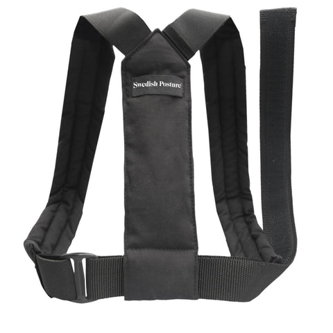 • Der Haltungstrainer Schwarz S-M ist ein schwarzer Haltungskorrektor mit verstellbaren Gurten und einem Swedish Posture-Label auf der Rückseite.