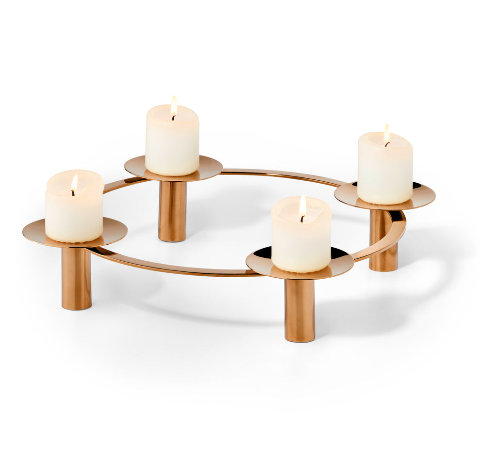 Moderner runder Kerzenhalter aus Bronze mit vier brennenden Stumpenkerzen auf weißem Hintergrund.