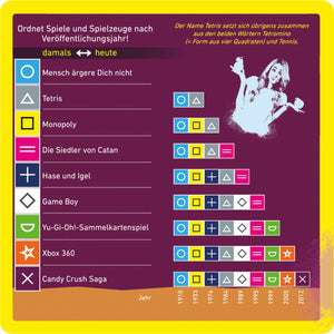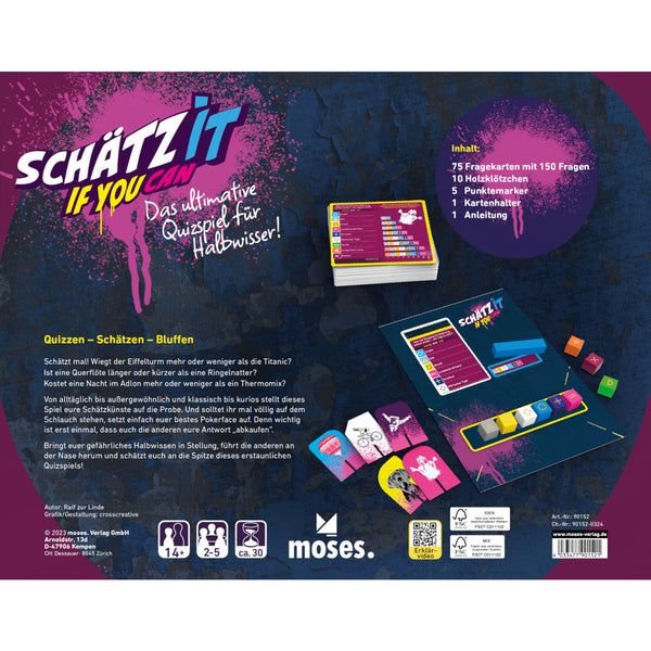 Dieses Spiel vereint außergewöhnliche Quizfragen mit Halbwissen und Bluffen. Denn bei „Schätz it – if you can“ gewinnt nicht, wer am meisten weiß, sondern wer am besten blufft. Spieler*innen, die am Zug sind, decken die Begriffe in der richtigen Reihenfolge auf. Der*die nächste Spieler*in bringt die Begriffe entweder in die richtige Reihenfolge oder segnet die Reihenfolge ab und deckt einen weiteren Begriff auf. Bei Anzweiflung werden die Antworten direkt kontrolliert.