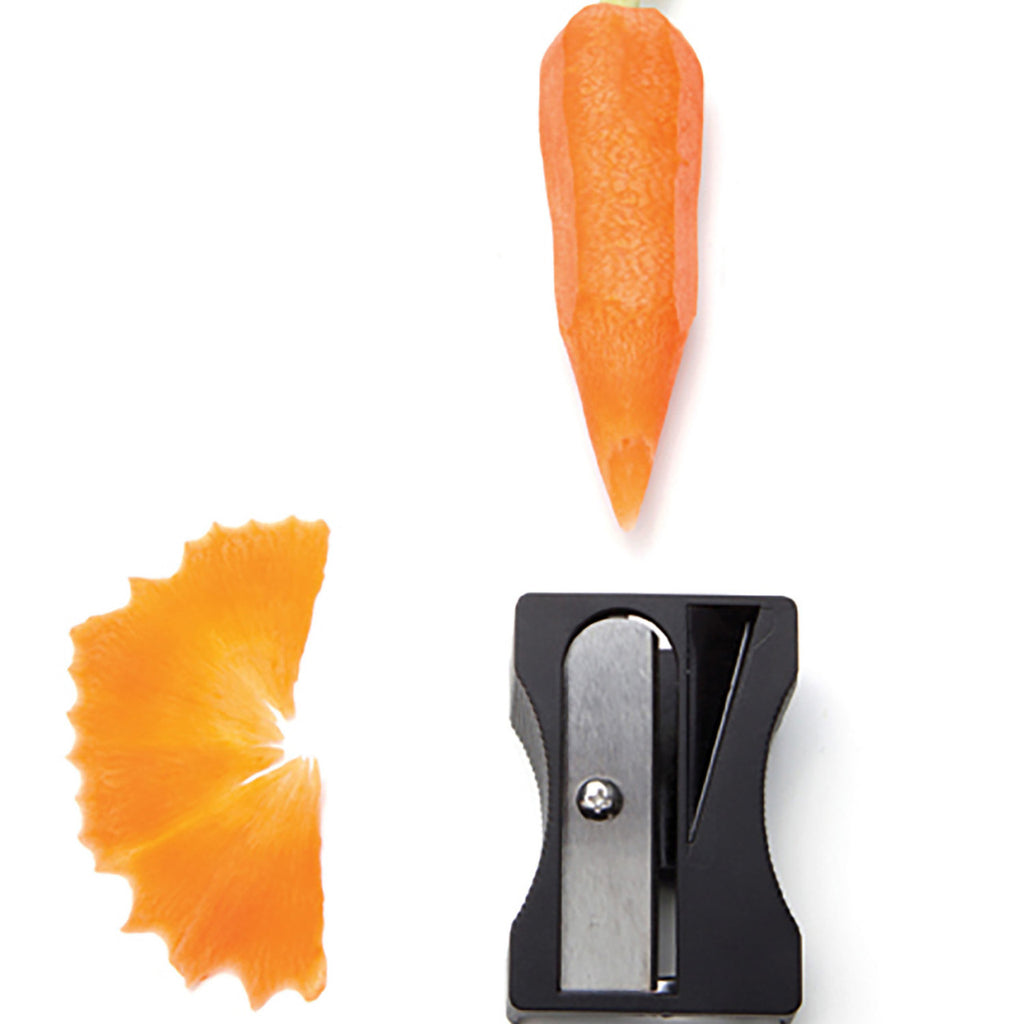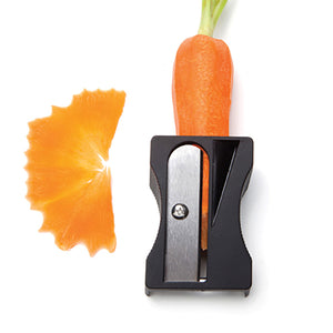 • Der Karoto Gemüseschäler und -spitzer - Schwarz spitzt eine Karotte, daneben befindet sich eine gekräuselte Schale auf weißem Hintergrund.