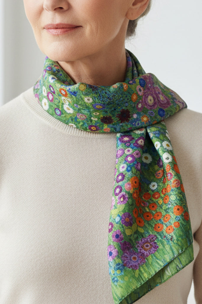 Mit diesem edlen Seidenschal tragen Sie ein Stück Kunstgeschichte. Das Motiv basiert auf Gustav Klimts berühmtem Gemälde „Bauerngarten mit Sonnenblumen“ (1907) und fängt die leuchtende Farbvielfalt und ornamentale Fülle des Originals eindrucksvoll ein. Die feine, reine Seide verleiht dem Tuch einen eleganten Glanz und ein angenehm leichtes Tragegefühl. Ob als Halstuch, Stola oder modisches Accessoire – dieser Schal bringt künstlerische Ausdruckskraft und zeitlose Eleganz in perfekte Balance.