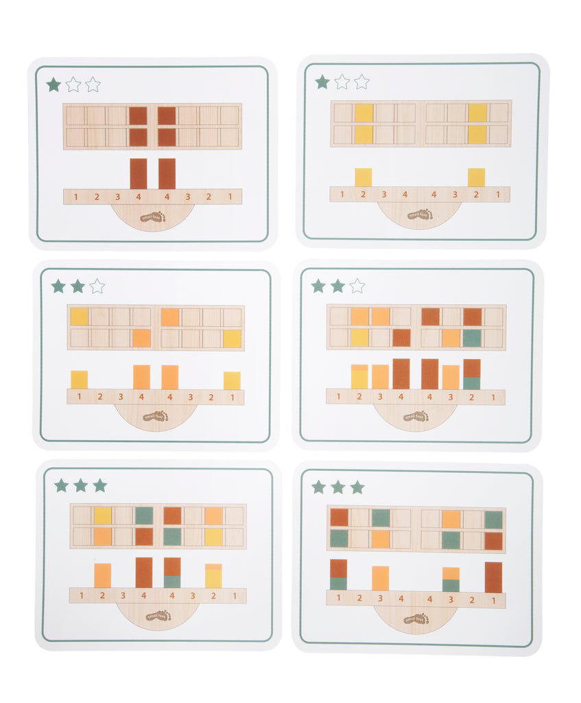 Spielerisch Balance halten und dabei lernen, wie Gewicht, Hebelwirkung und Proportionen zusammenwirken! Dieses Montessori Balancierspiel aus FSC® 100%-zertifiziertem Holz lädt Kinder dazu ein, ihre Balance-Fähigkeit durch geschicktes Stapeln von Balancierblöcken zu trainieren und die Bedeutung von Gleichgewicht zu verstehen. Die Basis bildet eine stabile Wippe, in deren Vertiefungen unterschiedlich hohe und schwere Holzblöcke geschickt eingesetzt werden müssen, um das Gleichgewicht zu halten. Bestandteil des Spielsets sind 16 farbige Holzblöcke und inspirierende Beispielkarten, die als Anleitung dienen und durch unterschiedliche Schwierigkeitsgrade Abwechslung ins Spiel bringen. So können Kinder je nach Alter und Fähigkeit frei stapeln oder gezielt nach Vorlage spielen. Der Schwierigkeitsgrad lässt sich flexibel anpassen – ideal, um Kinder stetig zu fordern, ohne sie zu überfordern. Ideal für kleine Tüftler und die ganze Familie! Das Montessori Balancierspiel aus hochwertigem Holz ist ein pädagogisches Stapelspiel, das Kindern auf spielerische Weise das Thema Balance und Gleichgewicht näherbringt. Die aufgedruckten Zahlen auf der Wippe helfen Kindern, Zusammenhänge zwischen Gewicht, Position und Balance zu verstehen – ganz im Sinne des Montessori-Lerngedankens, der auf selbstständigem Ausprobieren und eigenem Erkennen beruht. Beim Stapeln und Balancieren trainieren die kleinen Spieler nicht nur ihre Feinmotorik, sondern auch Geduld und Hand-Auge-Koordination. Gleichzeitig unterstützt es die kognitive Entwicklung und schult logisches Denken – perfekt als Montessori-Spielzeug für Zuhause, im Kindergarten oder in der Ergotherapie.