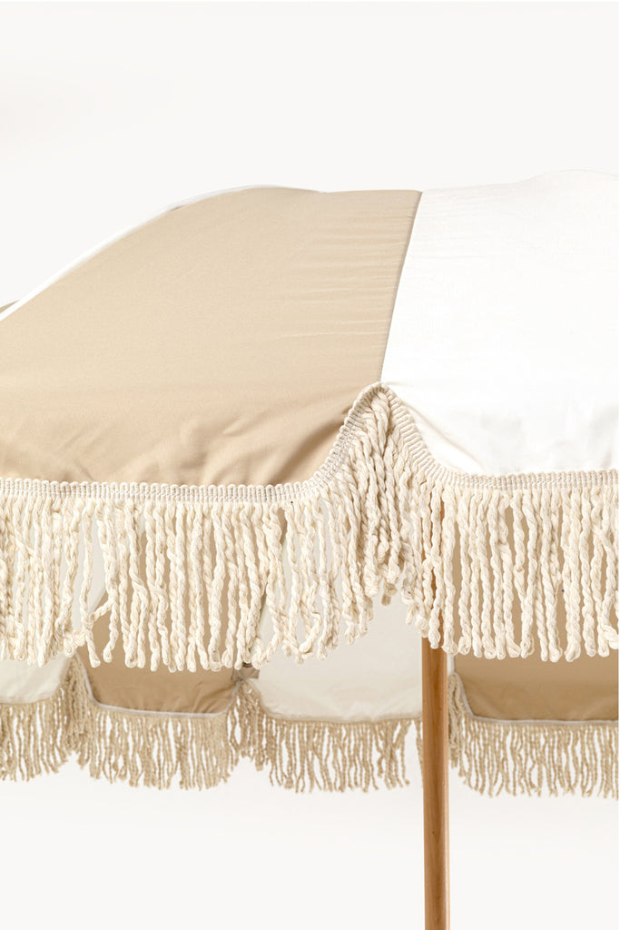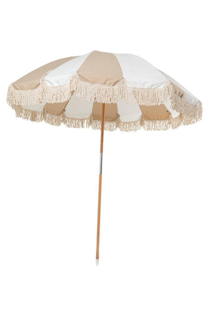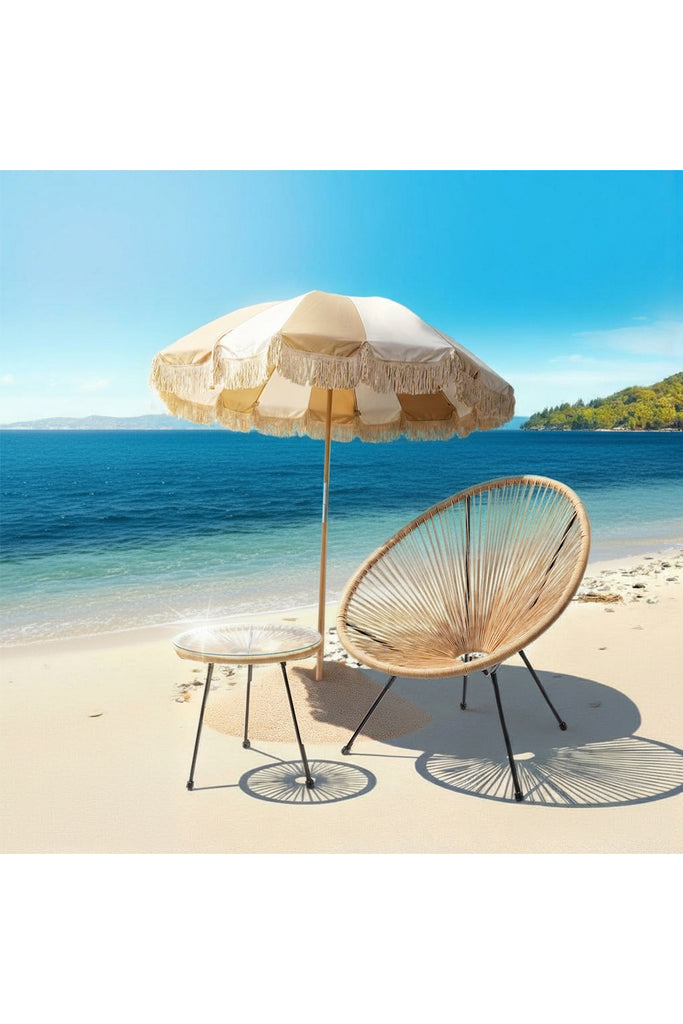 Dieser große, runde Sonnenschirm in Beige und Weiß bringt mit seinen klassischen Streifen und der eleganten Fransenkante stilvollen Retro-Charme in den Outdoor-Bereich. Der Mast aus Buche-Massivholz verleiht dem Design Stabilität und unterstreicht die natürliche Ausstrahlung. Großzügiger Schatten macht Terrasse, Balkon oder Garten im Handumdrehen zur entspannten Sommerzone.