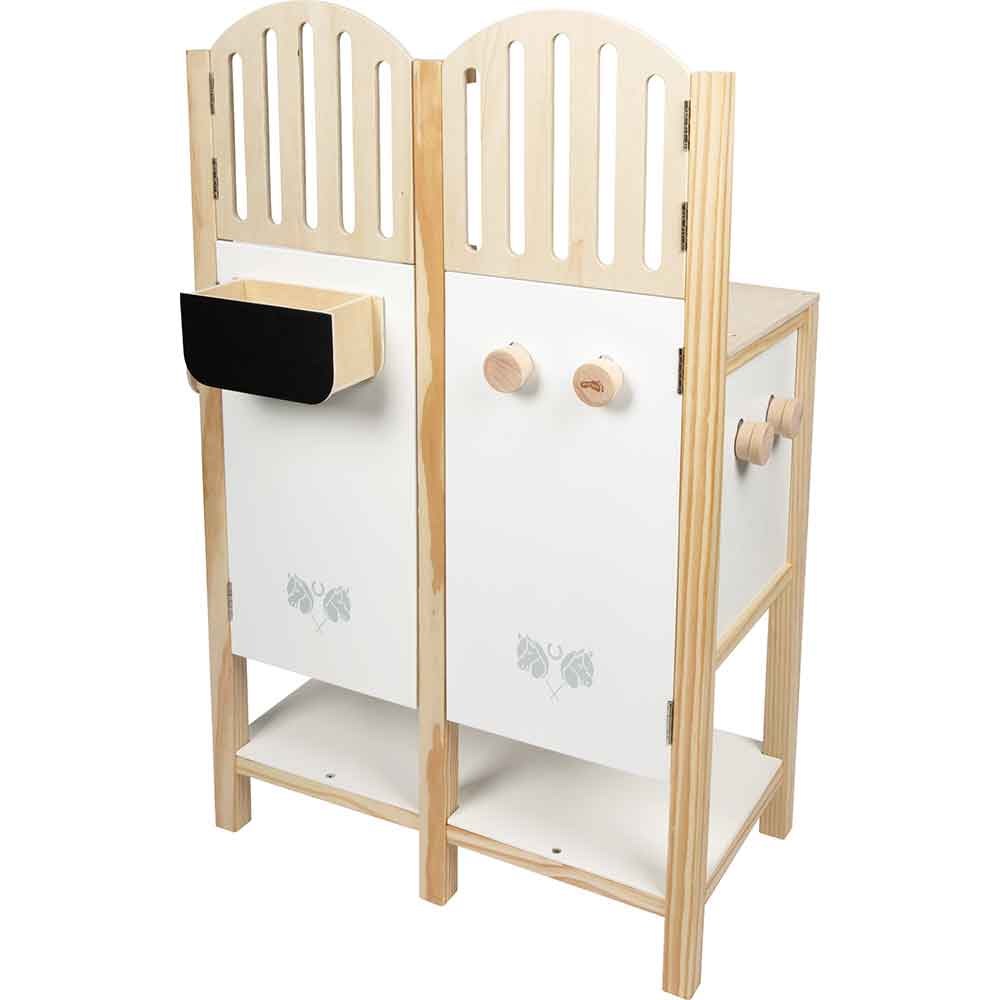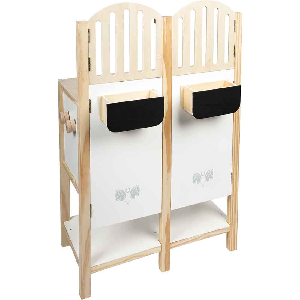 • Hobby-Horse-Pferdestall aus Holz mit zwei offenen Türen, zwei Einlegeböden und einer Ausführung in Naturholz und Weiß.