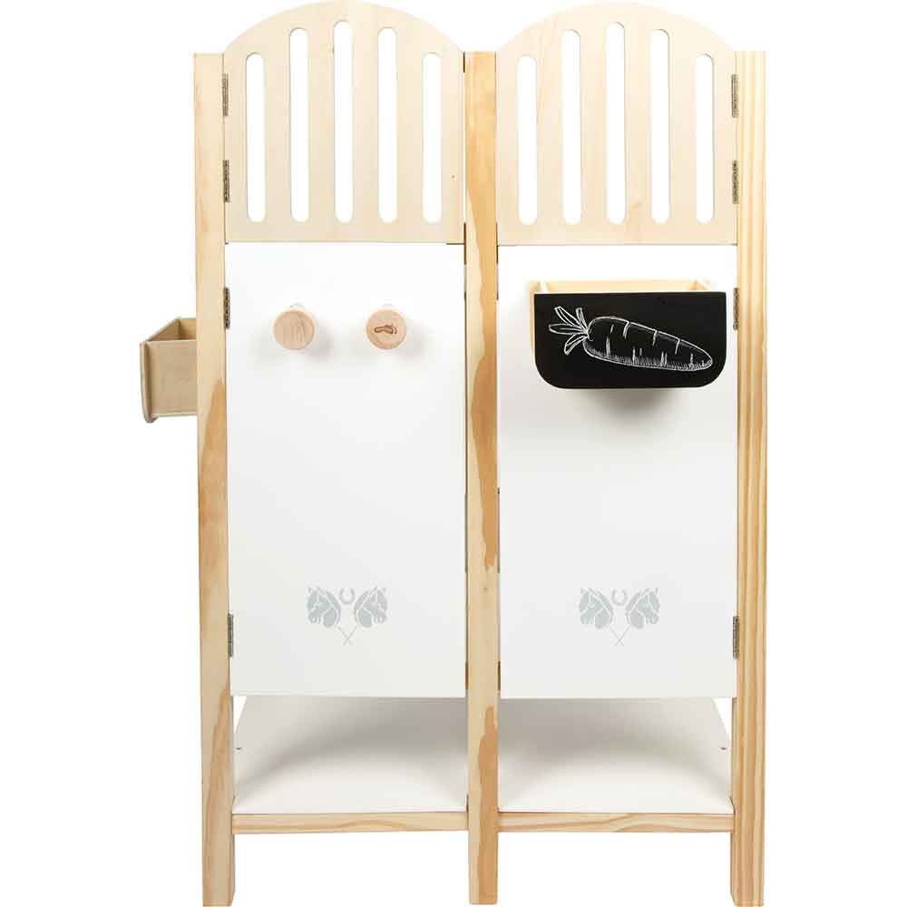• Hobby-Horse-Pferdestall aus Holz mit zwei weißen Türen, Holzknöpfen und einem Kreideschild mit einer Karottenzeichnung an der rechten Tür.