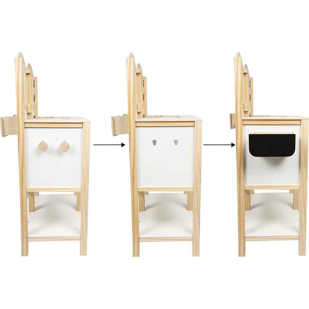Hobby-Horse-Pferdestall aus Holz mit Knöpfen, einem kleinen Regal und einer schwarzen Kreidetafel auf einer Seite.