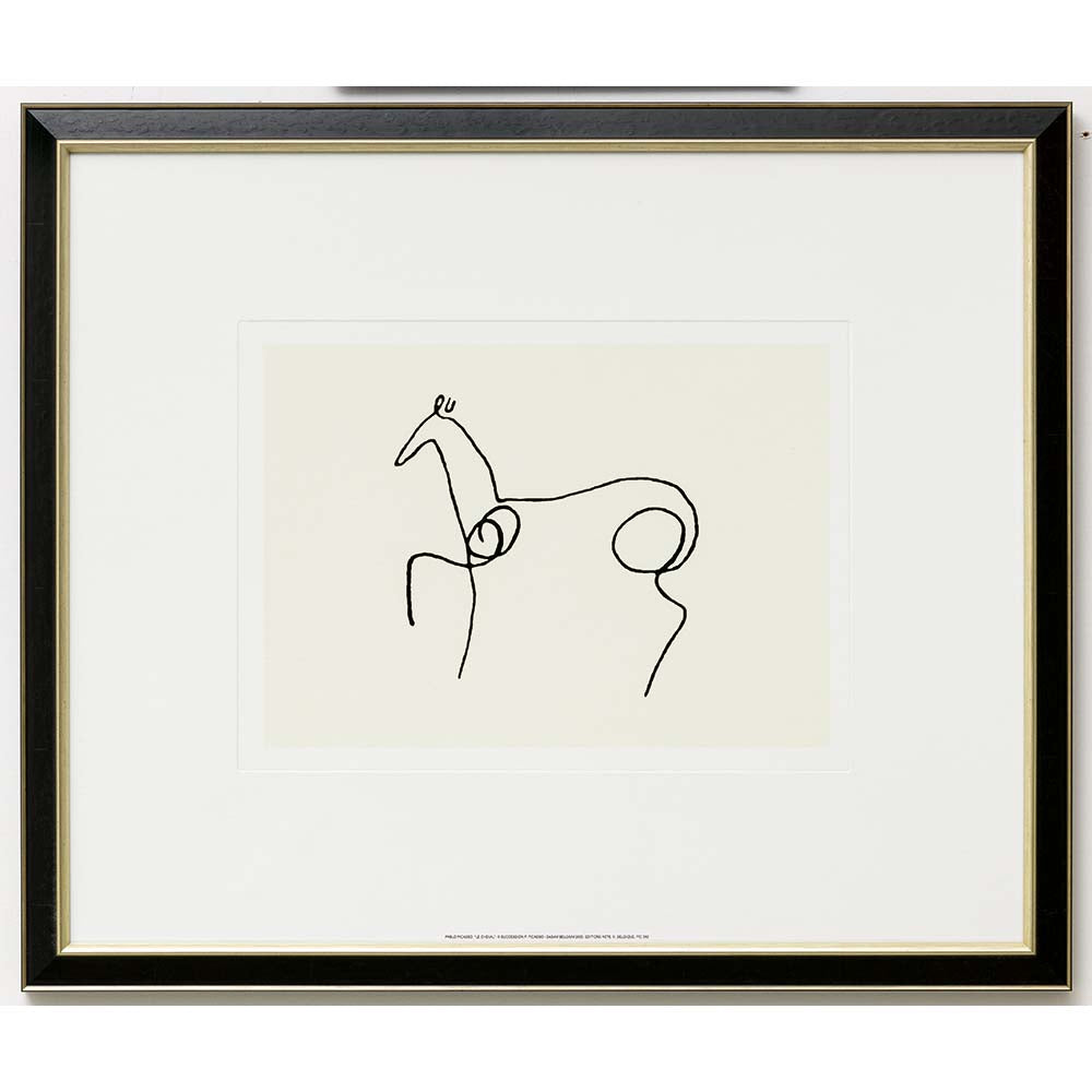 Mit sicherem Strich und unverwechselbarer Ausdruckskraft schuf Pablo Picasso in „Le Cheval“ eine Hommage an eines seiner zentralen Motive – das Pferd als Sinnbild für Kraft, Bewegung und Freiheit. Der hochwertige Kunstdruck bringt die Dynamik und Eleganz der Linienführung eindrucksvoll zur Geltung. Der schwarz-goldfarbene Rahmen unterstreicht die grafische Klarheit des Motivs und macht dieses Werk zu einem zeitlosen Blickfang in jedem Raum.