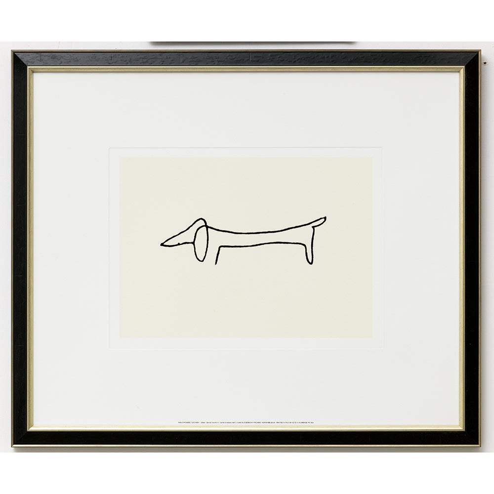 Mit wenigen Linien schuf Pablo Picasso ein Meisterwerk der Reduktion: „Le Chien“ zeigt die unverwechselbare Leichtigkeit seines Spätwerks und die spielerische Eleganz seiner Zeichnungen. Der hochwertige Kunstdruck bringt die feine Linienführung und den humorvollen Charakter des Originals eindrucksvoll zur Geltung. In einem schlichten, schwarz-goldfarbenen Rahmen präsentiert, wird dieses Werk zu einem modernen Klassiker für Ihr Zuhause – ein Stück Kunstgeschichte mit zeitloser Ausstrahlung.