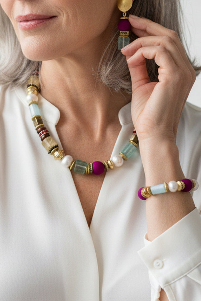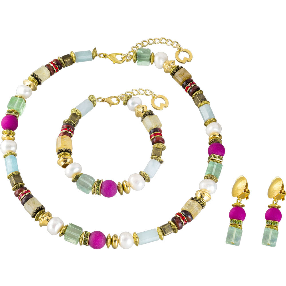 Die Farbenpracht verwandelte sich sofort in Inspiration zu diesem farbenfrohen Schmuckset aus gelb schimmerndem Citrin, frischem Aquamarin, lebendigem Fluorid, pinken Jaspis, Zuchtperlen und Tigerauge. Im Einklang mit teils 24ct. vergoldeten Messing Elementen und Swarovski Kristallen überträgt sich die Ruhe der Natur und schafft ein außergewöhnliches Schmuckset.
