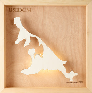 Kunstwerk in Holzrahmen mit einer ausgeschnittenen Karte der Insel Usedom auf hellem Holzhintergrund.