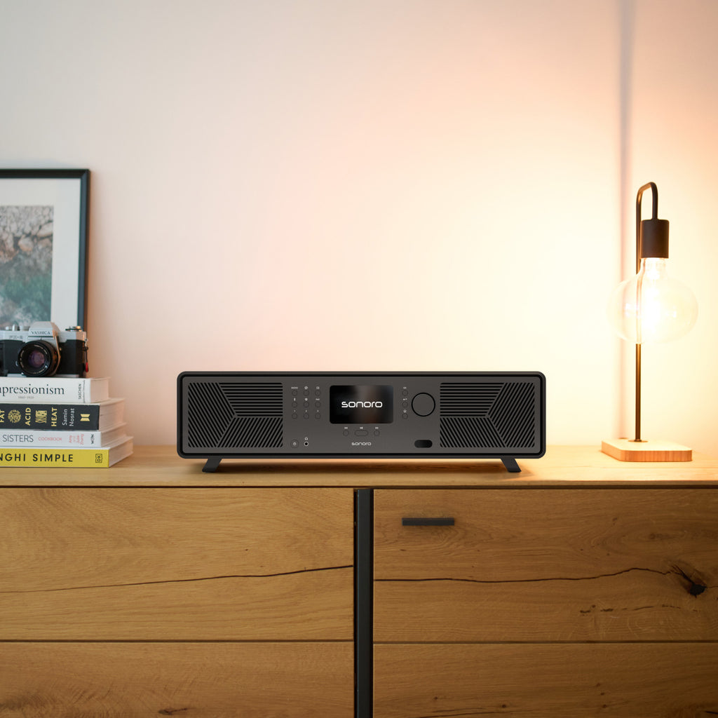 • Schwarzes Sonoro-Audiosystem auf einem Holzschrank mit Büchern, gerahmtem Foto und Glühbirnenlampe.