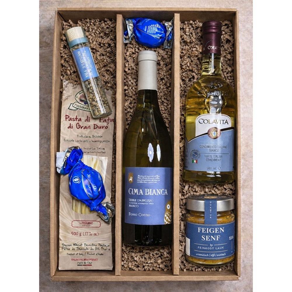 Erleben Sie den Geschmack Italiens in seiner schönsten Form: Hochwertige Pasta aus den Abruzzen, ein eleganter Weißwein, feines Condimento, aromatischer Feigensenf und süße Amaretti vereinen sich zu einem harmonischen Genusserlebnis. Dieses exklusive Set wurde sorgfältig zusammengestellt – für besondere Momente, als stilvolles Präsent oder für einen Abend, der nach Italien schmeckt.