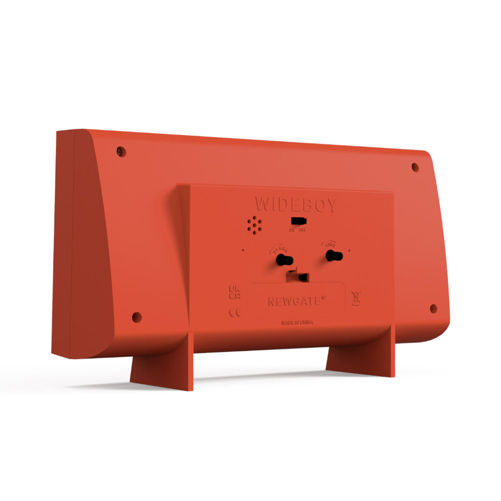 Rechteckiger Wecker Newgate Wideboy in orangefarbener Verpackung mit schwarzen Zahlen auf dem Zifferblatt.