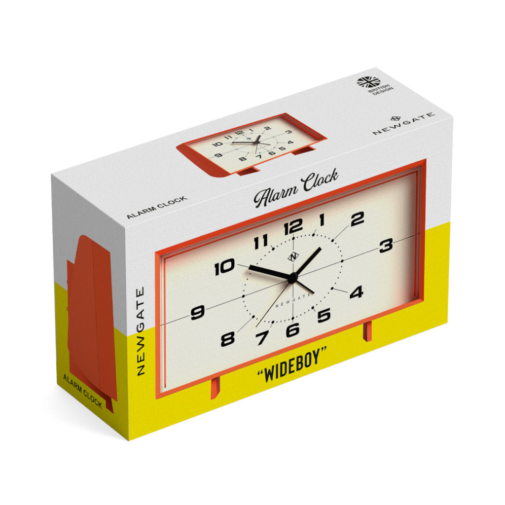 • Rechteckiger Wecker Newgate Wideboy in orangefarbener Verpackung mit schwarzen Zahlen auf dem Zifferblatt.