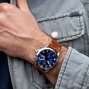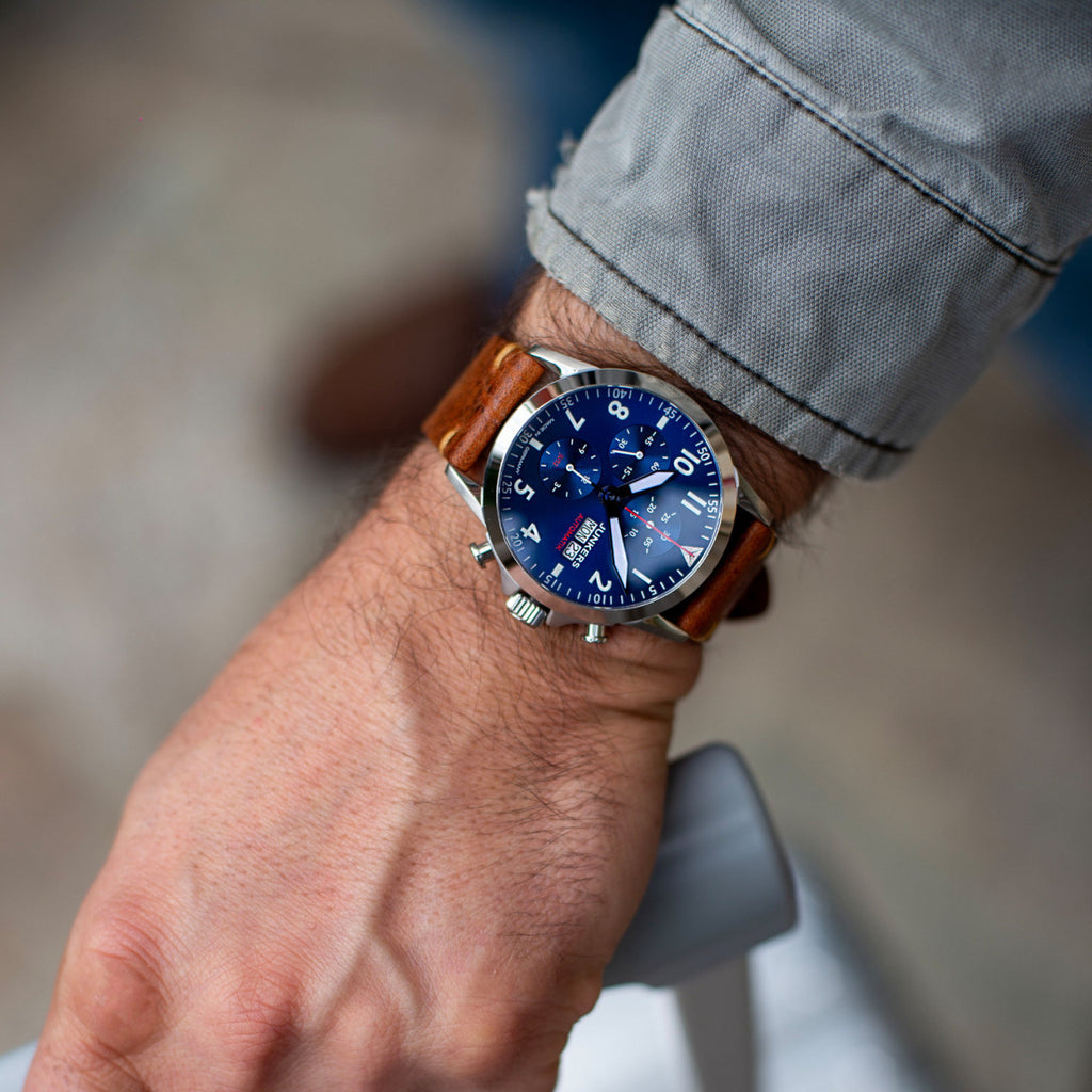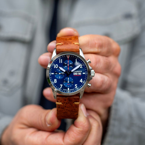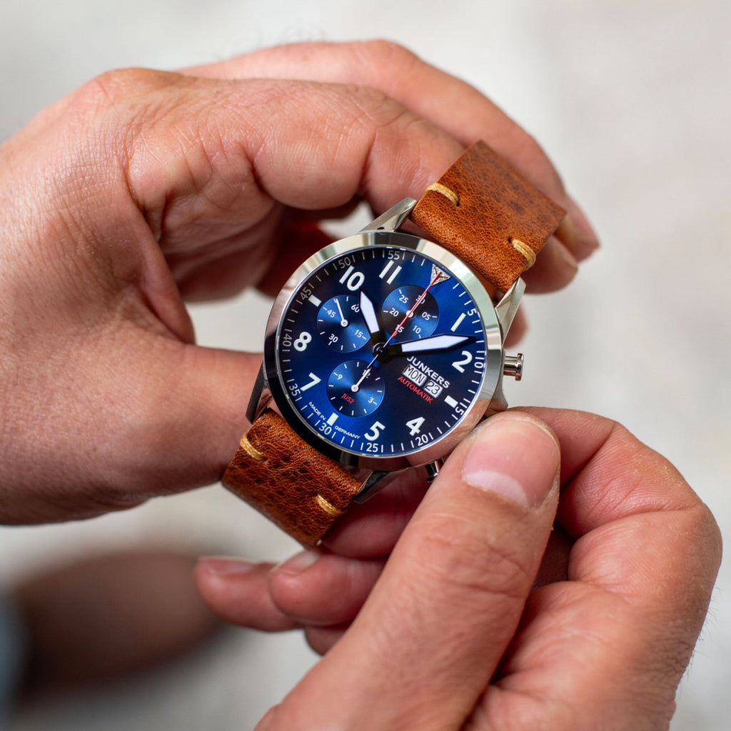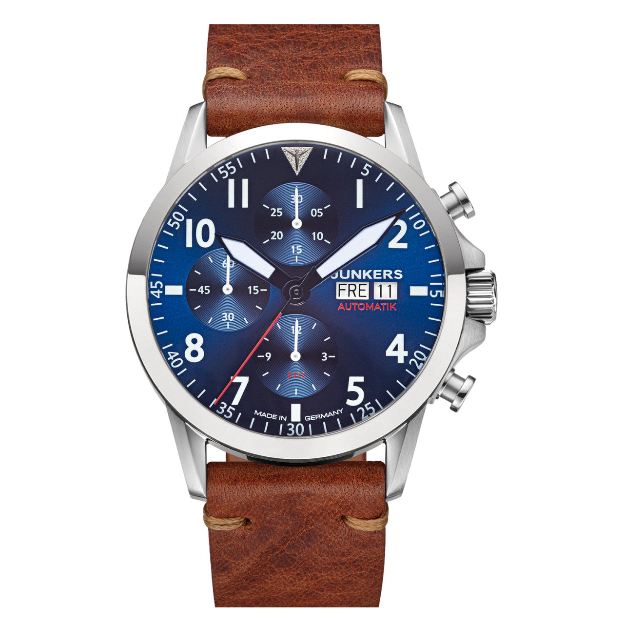 Der Junkers JU 52 Aviator hat ein schweizer Präzisions-Automatikwerk mit Chronographen-Funktion und Wochentag-Datum-Anzeige. Das Gehäuse dieser Hochleistungsmaschine ist besonders aufwendig entworfen, so dass es einerseits nach einem echten Statement aussieht, sich andererseits formvollendet an jedes Handgelenk legt.