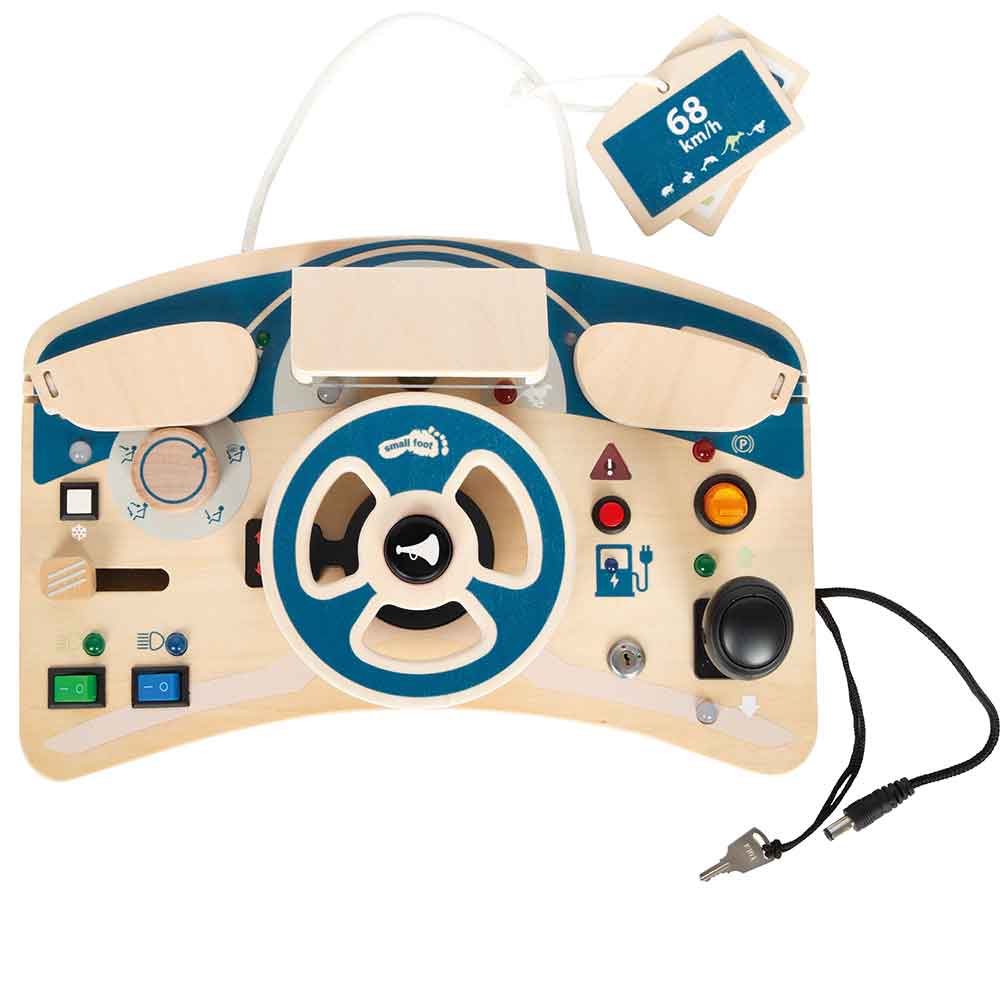 Licht an, Blinker setzen – losfahren wie die Großen! Dieses interaktive Autocockpit aus Holz vereint realistische Funktionen eines modernen Hybridfahrzeugs mit kindgerechtem Design: Mit LED-Lichtern für Blinker, Abblend- und Fernlicht sowie Warnblinker, Zündschlüssel mit Sound beim Anlassen, Gangschaltung, Handbremse und Hupe bringt dieses Kinderlenkrad die Extraportion Spielwert ins Kinderzimmer und sorgt für besonders langanhaltende Beschäftigung. Besonderes Highlight: Das austauschbare Heads-Up-Display mit Karten für Navi, Multimedia, Geschwindigkeit oder Batterie-/Tankanzeige, die sich per Band einhängen lassen – das Band dient gleichzeitig als Tragegriff für unterwegs. Zusätzlich sorgen einklappbare Seitenspiegel, eine seitliche Ladebuchse mit Stecker sowie Klima-Regler und Drehregler für Geschwindigkeit (inkl. Tier-Icons wie Schnecke, Hund oder Gepard) für realitätsnahe Spielerlebnisse – perfekt für fantasievolle Entdeckungstouren! Mit Abblendlichtern und Fernlichtern an der Frontkante. Es werden 3x AAA-Batterien benötigt (nicht enthalten). Speziell für kleine Autofans entwickelt, gefertigt aus stabilem Holz, vereint das interaktive Holzlenkrad-Spielzeug die wichtigsten Elemente eines echten Auto Cockpits – von Licht- und Soundfunktionen bis zu Bewegungselementen. Die Bedienelemente wie Schieberegler für die Lüftung, Klickknopf für die Klimaanlage und eine bewegliche Gangschaltung fördern gezielt die Feinmotorik. Ein ideales Lernspielzeug zur Förderung der sensorischen Entwicklung, Konzentration und Hand-Augen-Koordination. Als Reise-Aktivitäts-Spielzeug bietet das Spiel-Cockpit auch unterwegs abwechslungsreiche Spielimpulse und eine spannende Möglichkeit, die Welt der Elektronik sowie der elektronischen Schalter, Knöpfe und Regler spielerisch zu erforschen.
