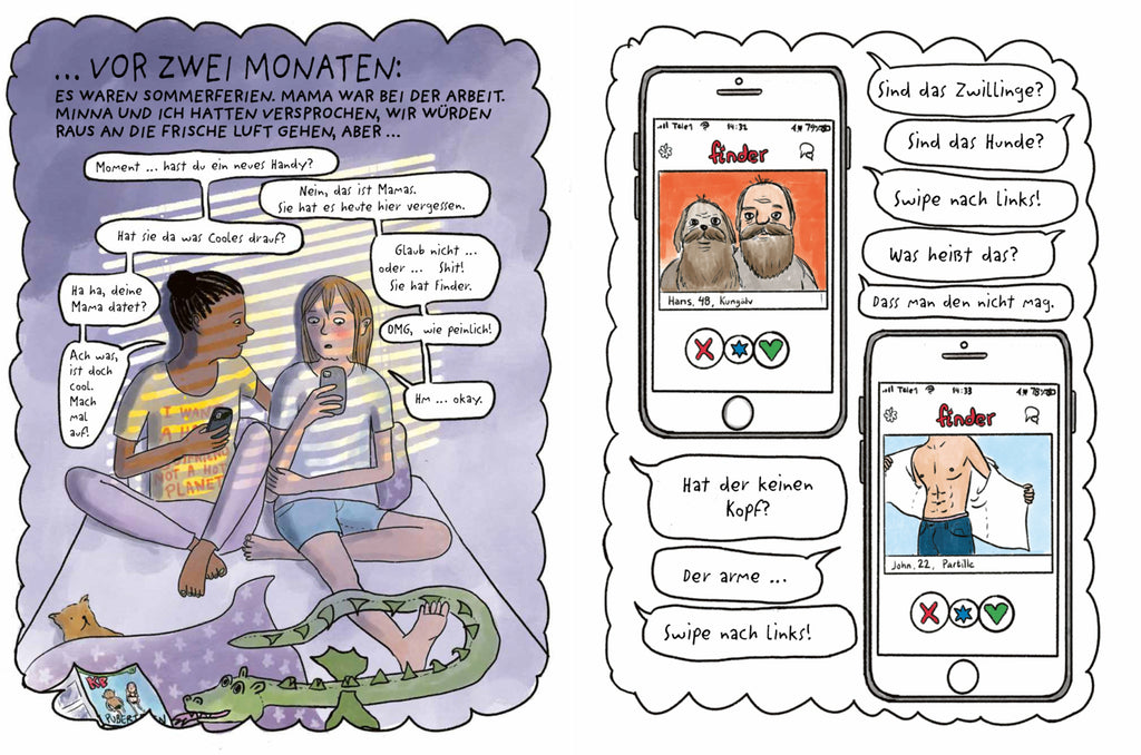 „Der süßeste Bruder der Welt“ hat Pickel und ist ein Grufti. Soll das ein Witz sein? Unbedingt! Denn dieser Patchwork-Comic zieht souverän alle Register von Aberwitz, Missverständnissen und Übertreibung: Dani ist ein Spenderkind, sie wünscht sich ein Geschwisterchen (mit Betonung auf -chen!), scheitert allerdings an ihrer alleinerziehenden Mama Sofia. Bis die sich in Björn verliebt und Bonus-Bruder Joschi frei Haus mitgeliefert wird. Man zieht zusammen, für Dani bedeutet das, die Schule zu wechseln, ihre beste Freundin zu verlieren – also alles blöd? Die Geschwister-Frage treibt weiter Blüten, zum Brüllen situationskomisch und lässig hinskizziert wird konsequent durchkonjugiert, was Lieben heißen kann. Letzter Satz dieses Feuerwerks: „Dann würde am Ende wohl doch alles gut werden.“ Stimmt!