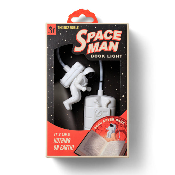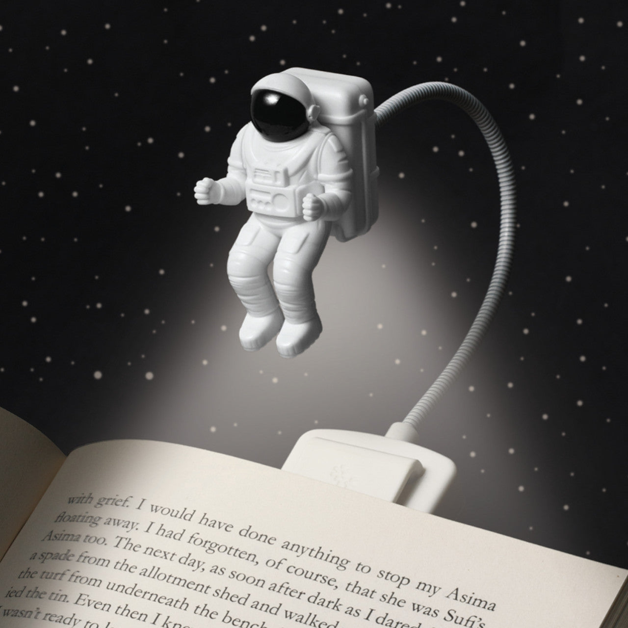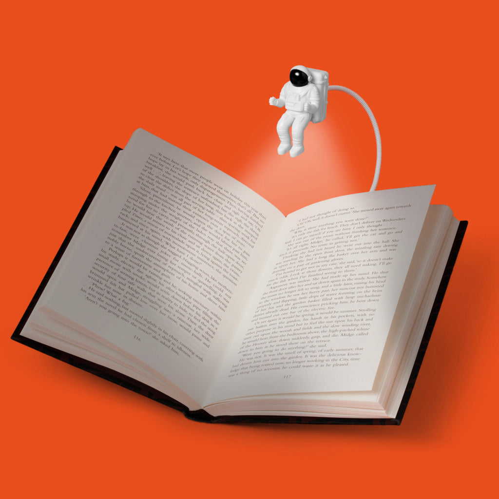 Leselampe für Weltraumgeeks jeden Alters. Dieser Retro-Astronaut wirft einen 2-LED-Lichtstrahl auf Ihr Buch und lässt Sie nicht im Dunkeln stehen. Klemmen Sie die "Basissteuerung" sicher auf Ihr Buch, stellen Sie die Helligkeitsstufe ein und bewegen Sie den biegsamen "Luftschlauch", um die richtige Leseatmosphäre für Sie zu schaffen! Ein kleiner Schritt für Buchliebhaber - ein riesiger Sprung zum Lesen im Dunkeln!
