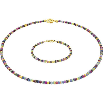 Edel und bezaubernd wirkt dieses Armband aus ungewöhnlich bunten Saphiren. Die zarten Rondelle sind facettiert und werden durch die goldenen Elemente akzentuiert. Edelstahlseil, 925er-Sterlingsilber vergoldet, Saphire. Länge 18,5 cm. Mit Karabinerverschluss.