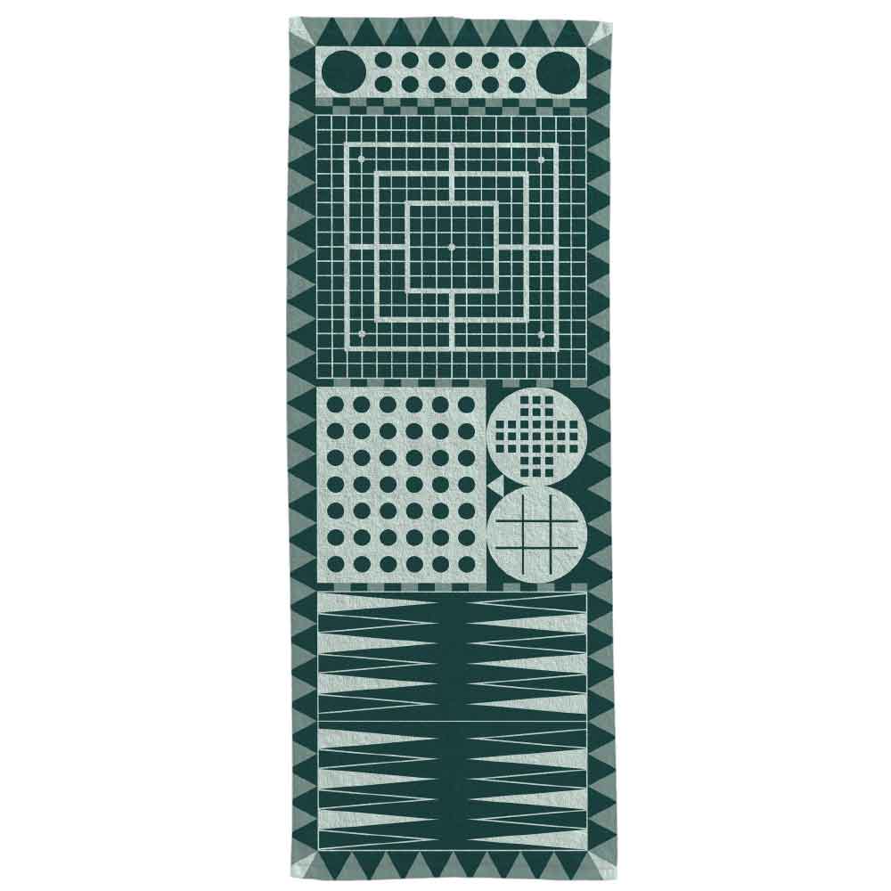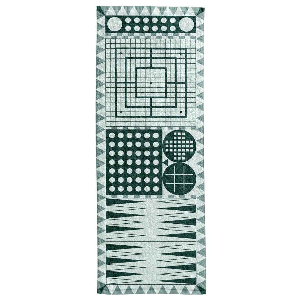 Handtuch, Sonnencreme, eine Flasche Wasser, Ersatz-Badekleidung, Sonnenbrille, vielleicht ein Buch – die Tasche für einen Nachmittag im Freibad oder am Strand ist schnell voll und schwer. Spiele passen da nicht mehr rein. Es sei denn… das Badetuch ist das Spielfeld! Dieses Badetuch löst nicht nur das Platzproblem, es ist sogar gleich sieben Spielfelder in einem: für Dame, Backgammon, TicTacToe, Vier in einer Reihe, Solitär, Mühle und Kalaha.
