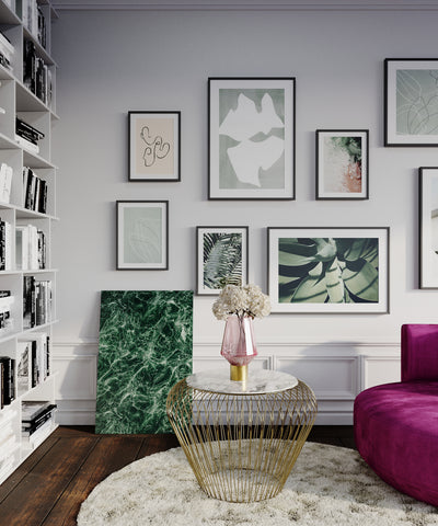 • Ein stilvolles Wohnzimmer mit einem weißen Bücherregal, gerahmter Kunst an der Wand, einem grünen Kunstwerk mit Blättern auf dem Boden und einem runden goldenen Beistelltisch „Beam Grau Marmor Brass“ neben einem violetten Sofa auf einem hellen Teppich.