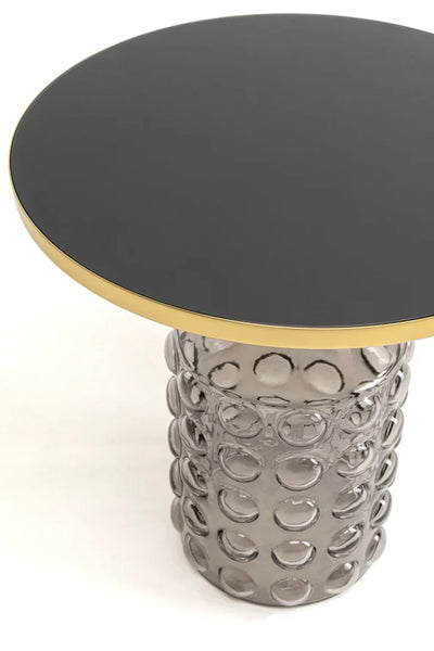 Runder Tisch mit schwarzer, glänzender Platte, goldener Kante und einem strukturierten Glasfuß mit Blasenmuster.