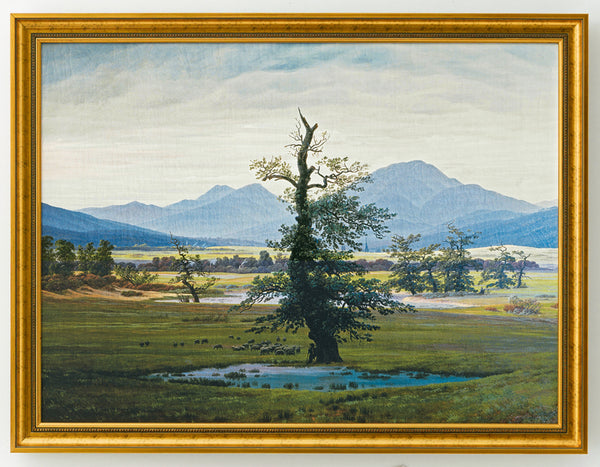 So viel ist gesagt worden von Kunstkritikern, Kuratoren, Interpreten über diesen Baum, die Landschaft, ja selbst die mathematisch präzise Bildkomposition Caspar David Friedrichs, dass man versucht ist, zu denken, weitere Worte seien unnötig. Und doch… In dieser Einsamkeit und Melancholie einer von unzähligen Jahren und Stürmen, von Gewittern und sengender Sonne gebeutelten, doch beharrlich lebendigen Eiche steckt eine Lebenslektion. Aus schrundiger Rinde, aus knorrigen Ästen reckt sich frisches Grün gen Himmel. Der Baum teilt nicht nur das Bild in zwei Hälften, verleiht ihm Tiefe, sondern tastet mit seiner Spitze nach dem hellen Wolkenschein, der sich über fernen Bergkuppen wölbt. Fast hört man die Kirchenglocken aus weiter Ferne im Hintergrund des Bildes. Friedvoll ist selbst die dunkle Moorlandschaft im Vordergrund, verschattet lenkt sie den Blick auf die dahinter liegende, helle Ebene, die beiden gotisch anmutenden Kirchtürme zur Rechten und den aufsteigenden Rauch aus warmen Kaminen kleiner Häuser zur Linken.