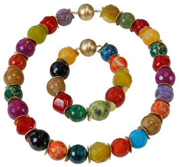 Blumenwiese, ein Name der für sich selbst spricht. Jaspis-, Achat-, Bambuskoralle-, Honig-Jade-, Jade-, Amethyst-, Aventurin-, Türkis-, Onyx-, Lapis- und Schaumkoralleperlen werden durch Elemente aus vergoldetem Metall aufgelockert.