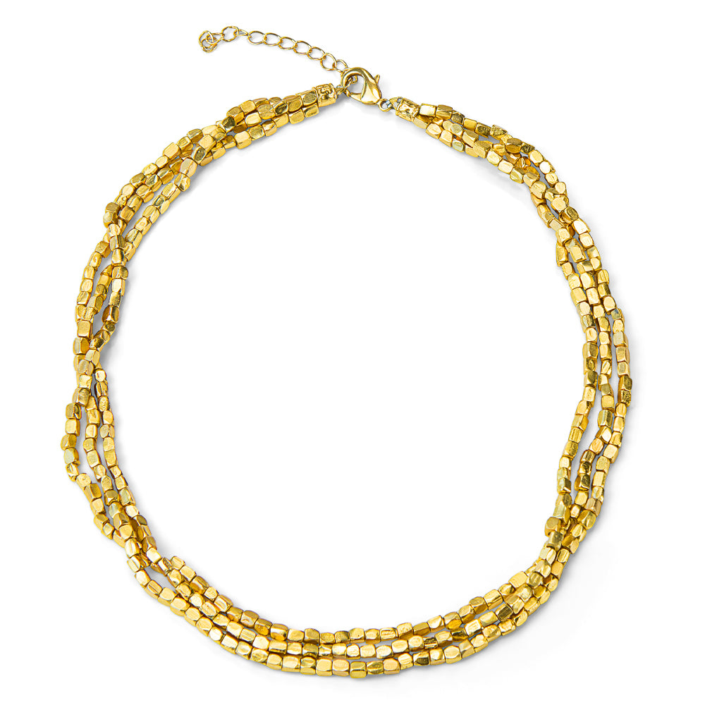 Dreireihiges Collier aus mit 24 Karat vergoldeten Metallperlen, längenverstellbar von 42-46,5 cm.