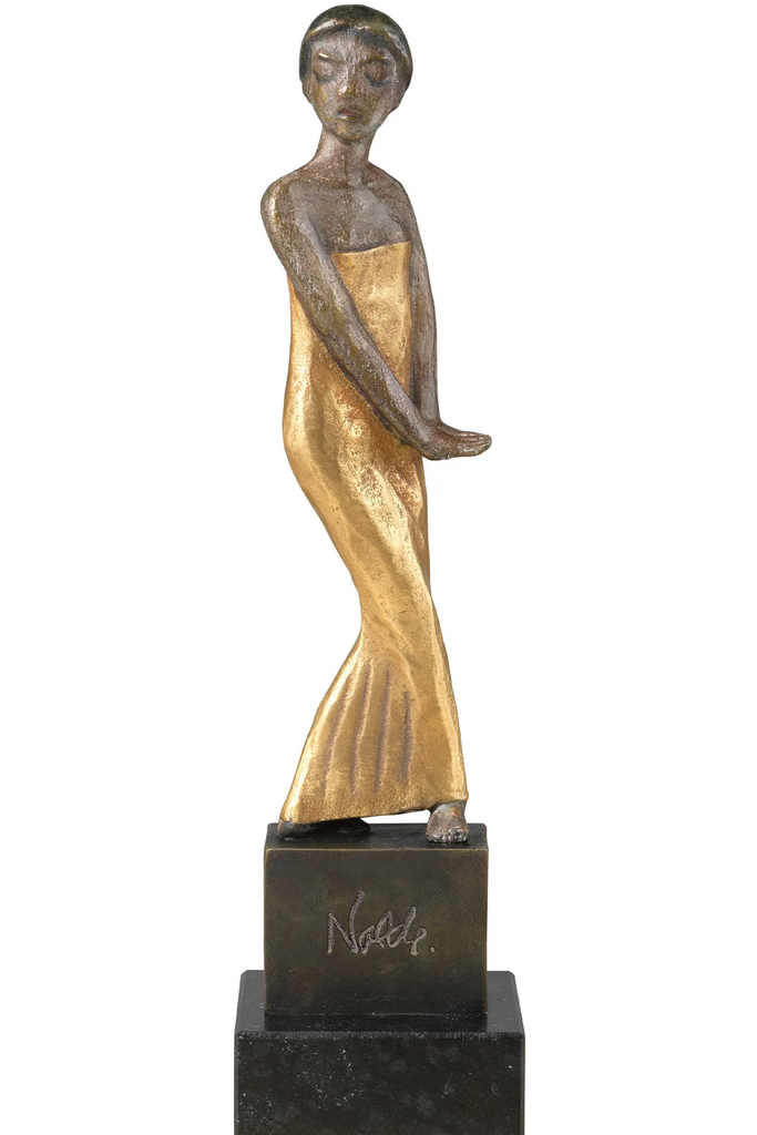 Die Skulptur „Java-Tänzerin“ (1913/14) zählt zu den seltenen plastischen Arbeiten Emil Noldes und zeugt von seiner intensiven Auseinandersetzung mit Bewegung, Ausdruck und Exotik. In dieser feinen Bronzeplastik fängt Nolde die anmutige Dynamik einer balinesischen Tänzerin ein – mit einer faszinierenden Mischung aus Spannung und Eleganz. Die teilvergoldeten Partien verleihen der Figur eine besondere Strahlkraft und betonen die fließende Bewegung des Körpers. Ein außergewöhnliches Sammlerstück für Liebhaber expressionistischer Kunst.
