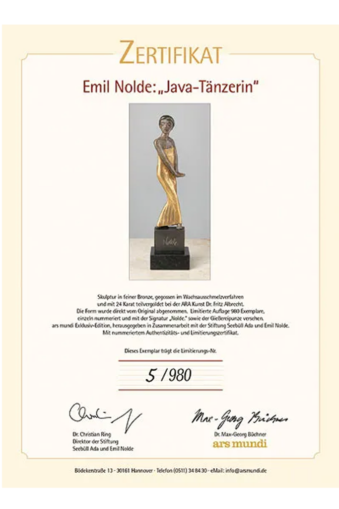 - Limitierte Auflage 980 Exemplare, nummeriert und mit Signatur sowie der Gießereipunze versehen. Herausgegeben in Zusammenarbeit mit der Nolde Stiftung Seebüll.