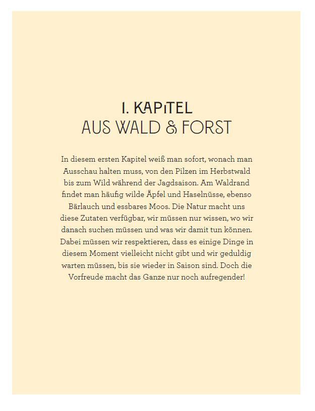 mit sieben Kapiteln: »Wald und Forst«, »Acker und Weide«, »Wiesen«, »Bäche und Hecken«, »Fluss und Meer«, »Obst- und Gemüsegarten«, »Bauernhof« und »Speisekammer«