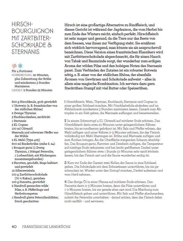 In den sieben Kapiteln orientiert er sich an der Landschaft seines Heimatlandes und präsentiert süße und herzhafte Rezepte wie Wildgulasch mit dunkler Schokolade und Sternanis, Kürbis-Ziegenkäse-Lasagne, Scholle mit Sellerie und Pancetta-Galette oder Kartoffelsuppe mit Spargel und Bärlauch.