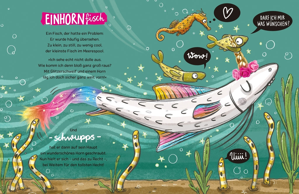 Hat der gestreifte Clownfisch etwa einen Clown gefrühstückt? Ist dem Hammerhai irgendwann einmal ein Hammer auf den Kopf gefallen? Und warum heißt der Einhornfisch eigentlich Einhornfisch, obwohl er keinen Glitzer pupst? In witzigen und fantasievollen Reimen erzählt Anne-Kristin zur Brügge, wie die verschiedensten Meerestiere zu ihren manchmal wirklich total behämmerten Namen kamen. Ob die Geschichten alle so stimmen? Nun, wer weiß das schon? Eines ist jedoch sicher: Sie machen Kindern und Erwachsenen gleichermaßen Spaß beim Vorlesen und Lust auf Meer.