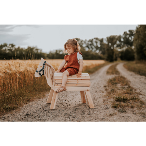 Ein Pony für den Pferdestall! Diese kompakte Version eines Holzpferdes ist der ideale Spiel-, Reit- und Voltigierpartner für noch junge Pferdenarren. Mit seiner Rückenhöhe von ca. 50 cm ist das Pferdchen auch für kleine Reiterinnen und Reiter problemlos und sicher erklimmbar! Ausgestellte Beine sorgen für den stabilen Stand. Besonders praktisch ist der mit einer Klapptür verschlossene Stauraum im Pferdebauch, in dem Halfter und eigenes Zubehör Platz finden. Mit Mähne und Schweif aus Sisal – ideal zum Flechten! Inkl. Halfter. Ein eigenes Holzpferd für den Garten oder das Kinderzimmer wünschen sich viele Kinder! Der Rücken dieses kleinen Holzpferdes ist von der Größe her so konzipiert, dass auch kleine Kinder bequem darauf sitzen können. Spielerisch lernen sie so die Grundlagen über Pferde, Ponys und das Reiten kennen. Mähne und Schweif aus Sisal laden zum Frisieren und Flechten – für fantasievolle Rollenspiele und spielerisches Feinmotoriktraining. Für eine langlebige Nutzung sollte das unbehandelte Holz mit einer Holzschutzlasur geschützt werden. Das Halfter mit Metallschnallen verfügt über einen Ring, an dem nach Belieben ein Führstrick angebracht werden kann.