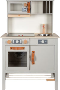 Kinderküche grau „tasty“: Spielküche aus Holz mit Herd, Backofen, Spüle und Regalen, mit braunen Griffen und grauen Akzenten.