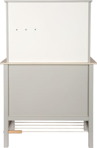 • Öffnen Sie die Schranktür „lecker“ in Kinderküche grau und entdecken Sie auf der Innenwand farbenfrohe Abbildungen von Speisen und Getränken.