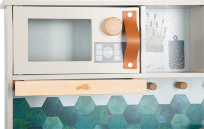 • Die Kinderküche grau „tasty“ verfügt über eine Spielzeugküche mit Mikrowelle und Schrank mit Holzknöpfen, einem Ledergriff und einem stilvollen blauen Sechseck-Fliesenmuster.