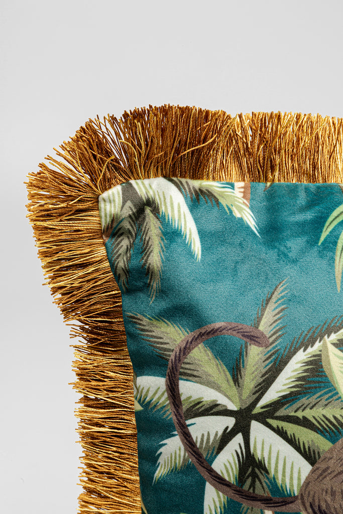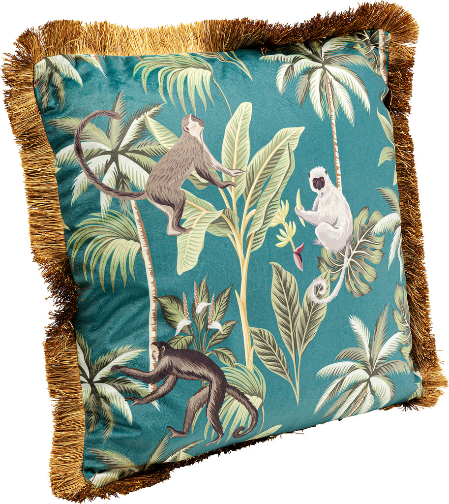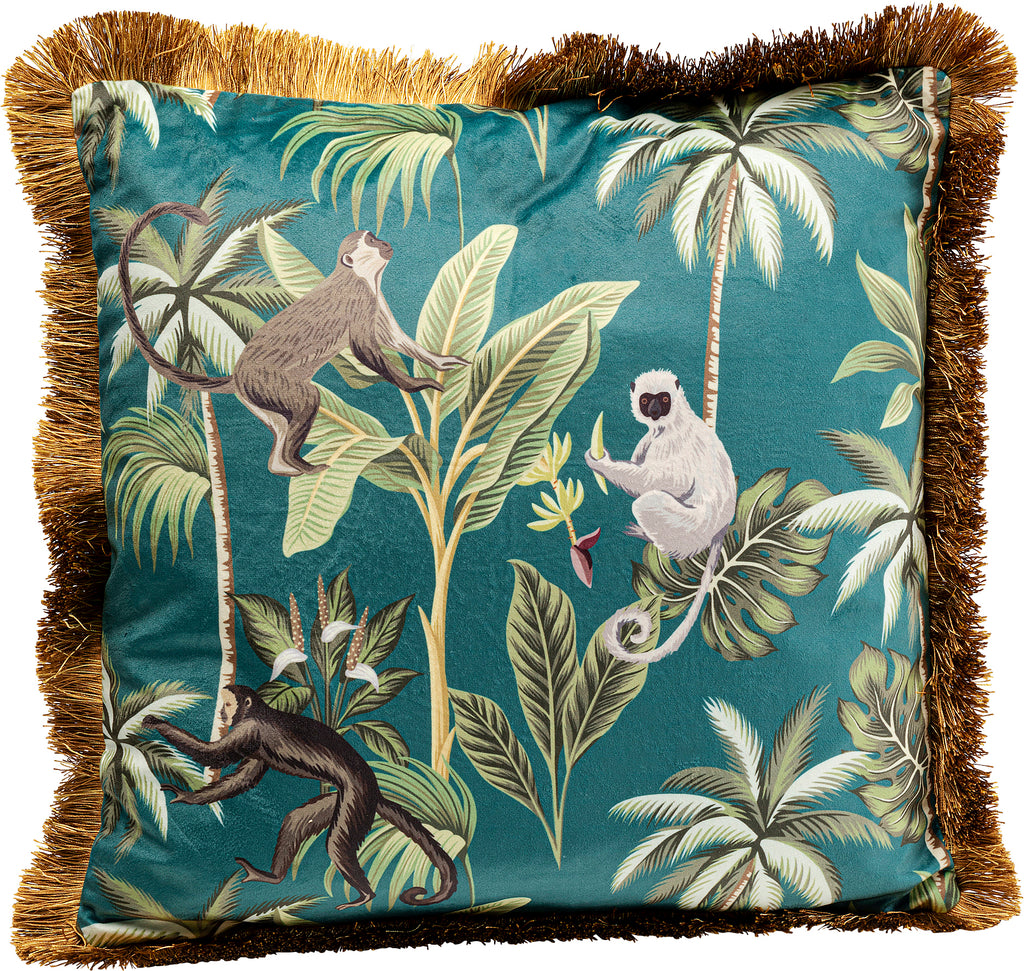 Dieses quadratische Wurfkissen bringt mit seinem exotischen Print und der dekorativen Fransenkante einen Hauch von Dschungel-Flair in Ihr Zuhause. Das Motiv mit Affen im Urwald, inspiriert von historischen Tapisserien und in Petrol-, Grün- und Goldgelbtönen gehalten, macht das Kissen zu einem besonderen Blickfang. Der dezent schimmernde Bezug betont den edlen Charakter, während es auf Sofa, Sessel oder Bett sowohl Stil als auch Gemütlichkeit verleiht. Dank seiner ausgewogenen Farbkomposition lässt sich das Kissen hervorragend mit neutralen Tönen kombinieren und setzt dabei einen subtilen, eleganten Akzent in jedem Raum.