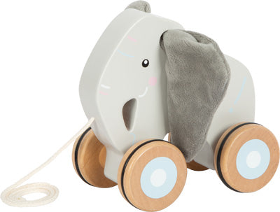 Das Nachziehtier Elefant mit Knisterohren ist ein Nachziehspielzeug-Elefant mit weichen, knisternden Ohren und Rädern.