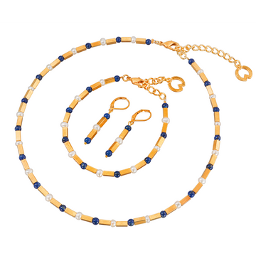 Dieses handgefertigte Collier besticht durch seine Zartheit und moderne Eleganz. Lapislazuli, Zuchtperlen und 24 Karat vergoldete Messingelemente. Karabinerverschluss.
