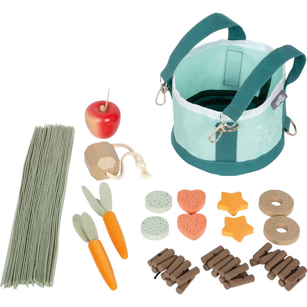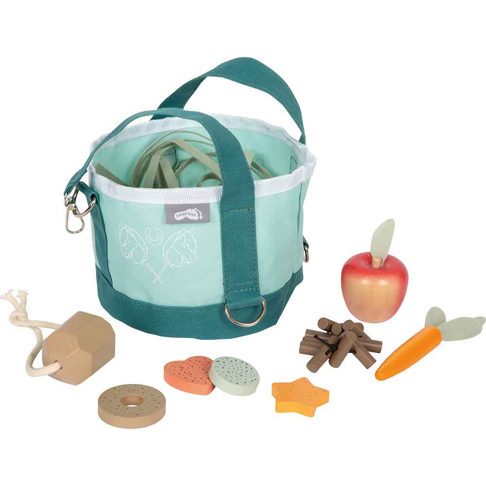 Dieses liebevoll gestaltete Pferdefutter-Set ist die perfekte Ergänzung für kleine Reiter:innen und ihre Spielpferde. Dieses umfangreiche Pferdefutter-Set enthält Heu aus Filz, gebündelte Pellets, einen Apfel, Möhren, einen Leckstein sowie Pferdeleckerlies aus Holz – ideal für das Rollenspiel mit Hobby Horses, Holzpferden oder Steckenpferden. Die praktische Futtertasche mit Tragegriffen dient nicht nur zur Aufbewahrung, sondern lässt sich durch Umklipsen der Henkel als Futtertrog verwenden sowie am Stall, Zaun oder ähnlichem befestigen. Ein Highlight und Must-have für realitätsnahe Rollenspiele rund ums Thema Pferd – zu Hause, im Garten oder unterwegs! Alles, was Spielpferde lieben! Das Spielset regt zu fantasievollen Rollenspielen rund um Pflege und Versorgung von Pferden an und schafft dabei Raum für kreatives Erzählen, fürsorgliches Verhalten und realistische Spielsituationen – dank kindgerechter Form und Größe lassen sich Apfel, Möhren, Leckstein, Filzheu und Pellets auch von kleinen Kinderhänden gut greifen. Die hochwertige Stofftasche bietet nicht nur Ordnung und Mobilität, sondern wird im Handumdrehen zum Trog.