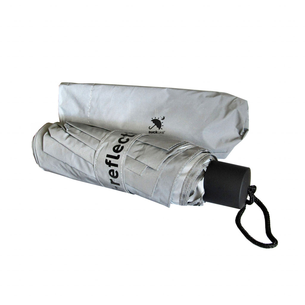 Dieser Regenschirm aus hell reflektierendem Material ist wie jeder Taschenschirm zum Ausziehen und hat in geöffneten Zustand einen Durchmesser von 100 cm.